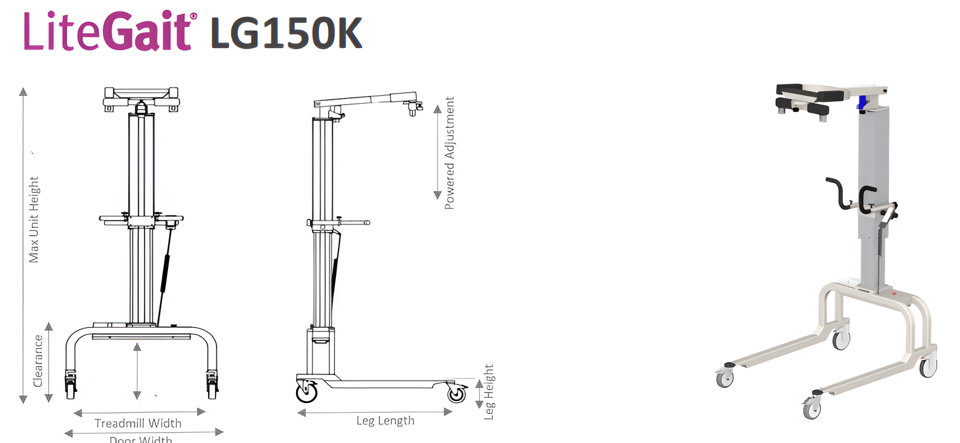 El modelo LG 150 es un entorno móvil, libre de caídas, con un exclusivo sistema de suspensión de doble punto y un arnés único en su tipo que controla la postura, el equilibrio y la carga de peso mientras el paciente camina sobre el suelo o sobre una cinta de correr. Las cuatro correas del arnés superiores ajustables independientemente controlan la postura/movimiento en tres planos, lo que hace que LiteGait sea ideal para pacientes con discapacidades asimétricas, ya que LiteGait es el único sistema diseñado específicamente para el control/corrección postural. El sistema LG 150 puede beneficiar a pacientes de prácticamente todos los niveles de capacidad/funcionamiento y se utilizan en múltiples tipos de entornos terapéuticos.